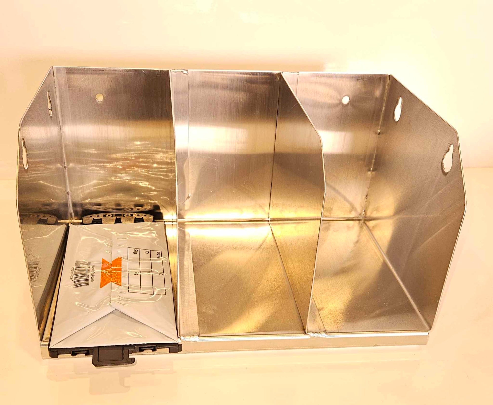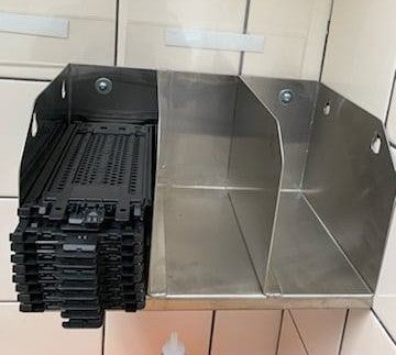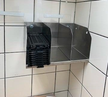 Stainless steel support for the new models of laminated envelopes for cash deposits. 3 sections Very practical, to be mounted on the wall near the safe. No more need to leave them lying around and scattered in a large cardboard box; see the 2 models."